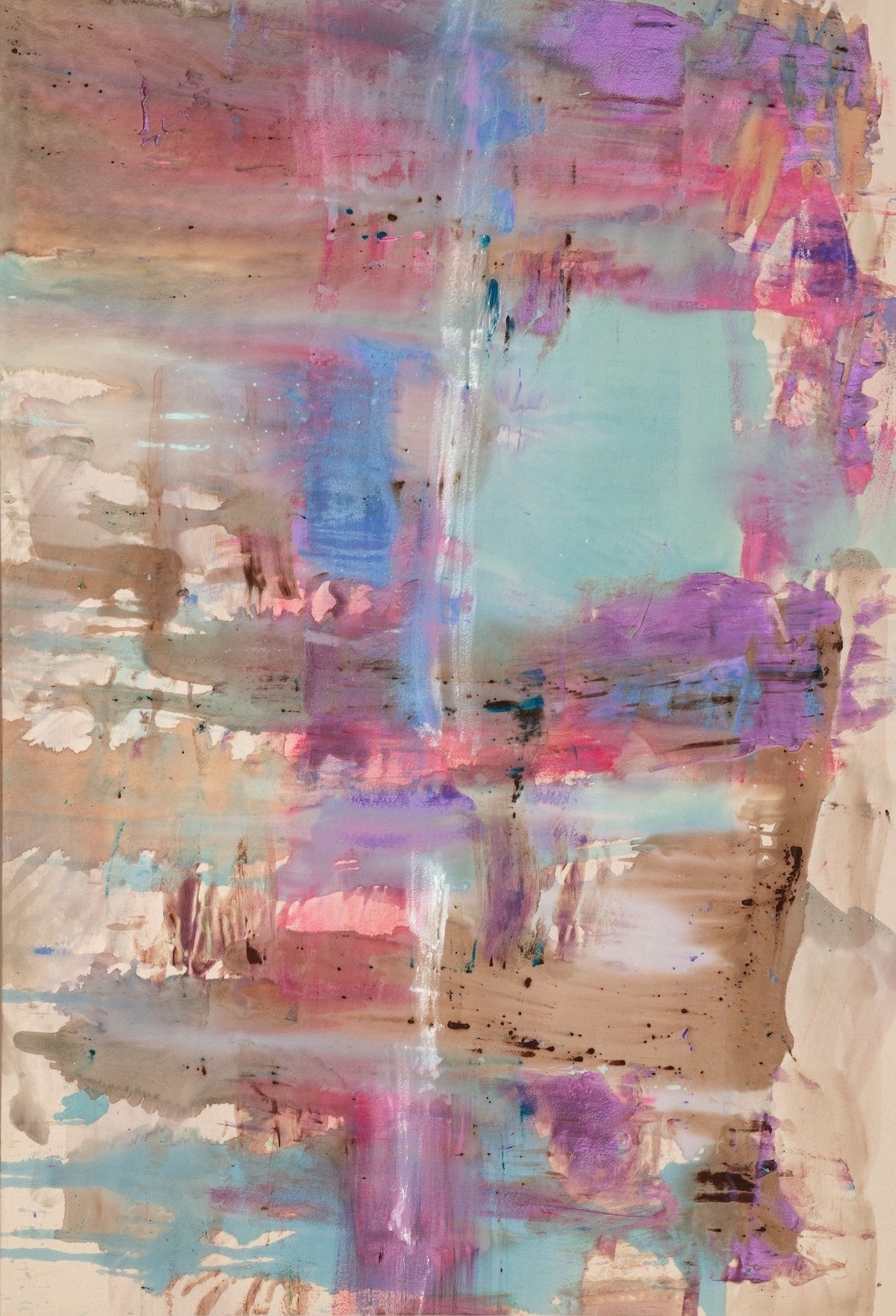 The last painting in the loose and open vein of Airlift and Heartbeat is Arete (2024), a vertical picture intermittently bisected by a ghostly white brushstroke. Unlike the other two works, Arete features an earth-toned palette, and is more densely painted. The few areas of unpainted canvas, found mostly around the edges, are utilized less as a framing device than as a color—the painting’s brightest, shining through the composition. Taken together, these three paintings indicate a new direction in Tint’s art, a rethinking and revitalization of the techniques that have long characterized her work. Though stained and layered, their colors are disembodied and transparent, often—especially in Airlift—seeming to float free of the canvas. Their effect on the viewer is gradual and immersive, unlike some of the artist’s more brashly colored and pressurized works.