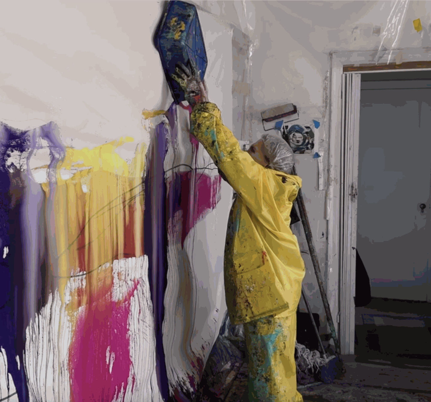 But as the pigments splashed all over her “painting garb,” as Tint calls her attire, attest, the journey is here, in this workshop, before canvases the size of standard school buses and colors so luscious you want to ingest them. This work — her work — is “my travel, my marriage and my children,” Tint said.